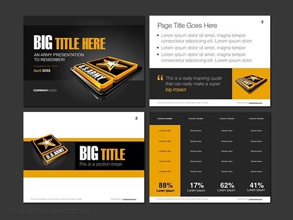 Fully editable 4-page PowerPoint presentation template with a US Army logo theme. Includes a cover slide, text slide, table slide, and transition slide.