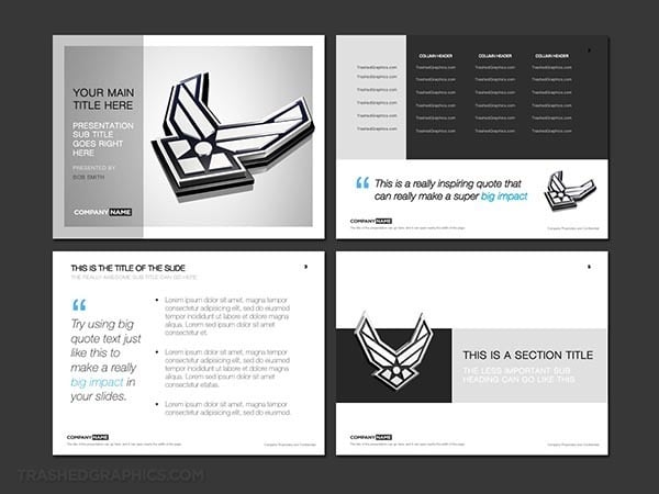 Fully editable 4-page PowerPoint presentation template with a silver US Air Force theme. Includes a cover slide, text slide, table slide, and transition slide.