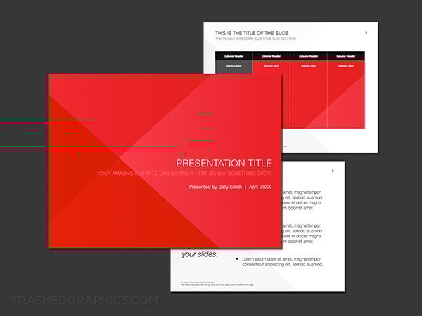 Fully editable 3-page PowerPoint presentation template with a red and abstract flat design theme. Includes a cover slide, text slide, and table slide.