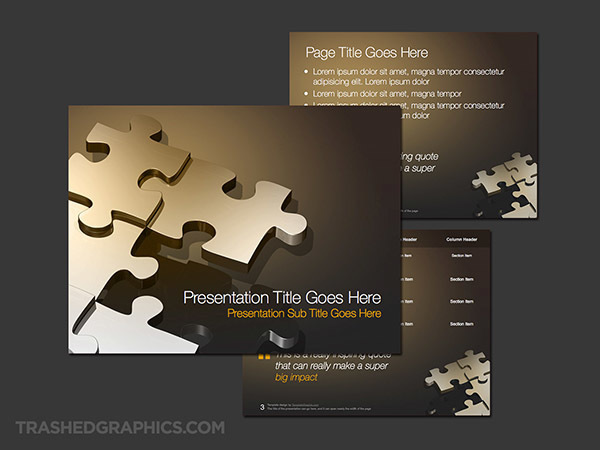 Fully editable 3-page PowerPoint presentation template with a bronze puzzle pieces theme (perfect for corporate strategy topics). Includes a cover slide, text slide, and table slide.