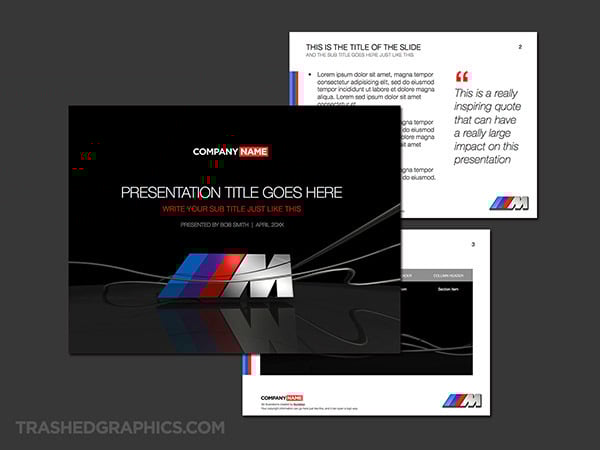 Fully editable 3-page PowerPoint presentation template with a BMW M logo theme. Includes a cover slide, text slide, and table slide.